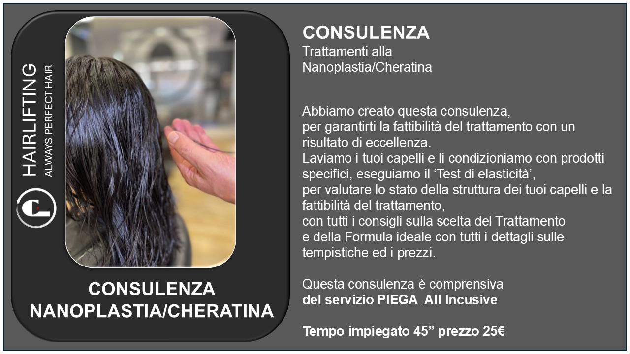 Il primo passo per avere la certezza del miglior risultato è la “consulenza personalizzata”, la migliore occasione per conoscere lo stato dei tuoi capelli ed i tuoi desideri e darti tutti i nostri consigli sulla scelta del “trattamento ideale”. In questa consulenza, comprensiva del servizio Piega, eseguiremo il test di elasticità per valutare lo stato di salute dei tuoi capelli e ti daremo tutti i dettagli sulle tempistiche ed i prezzi del trattamento consigliato.